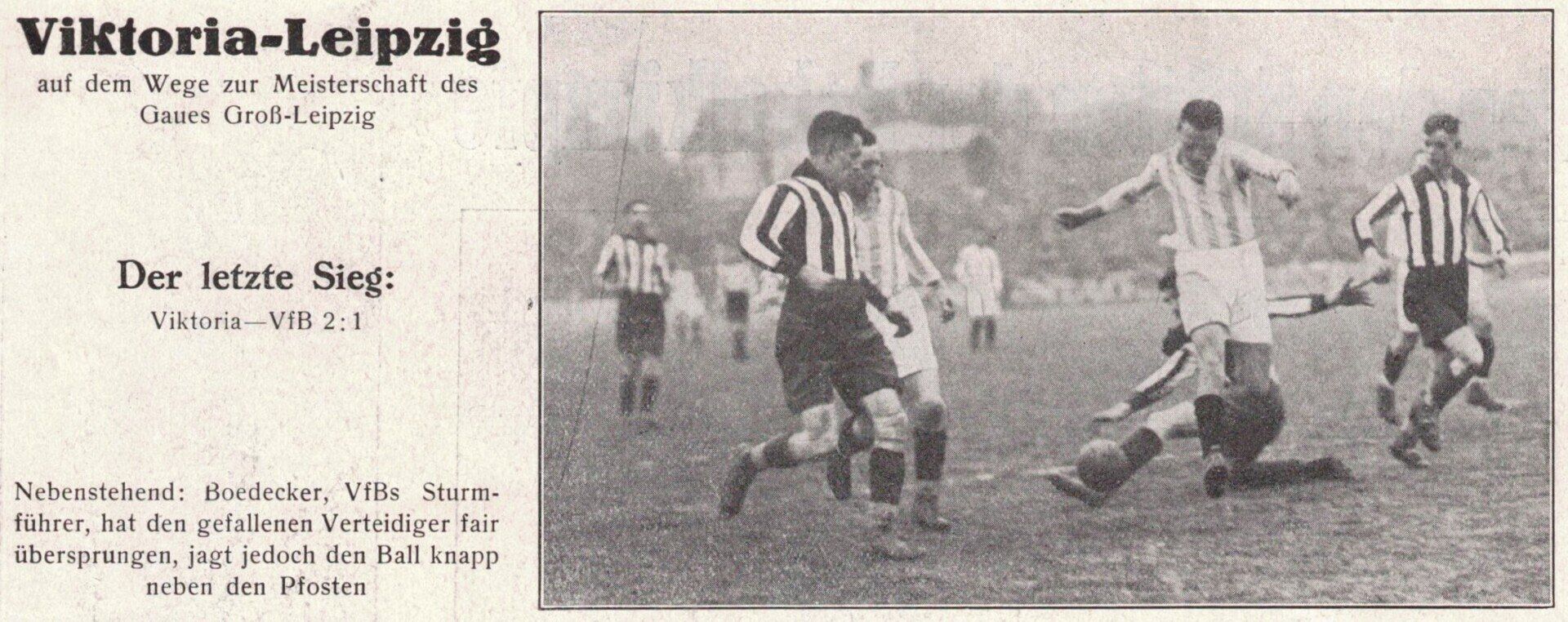 Eine weitere große Tat vollbrachte die Mannschaft, als der damalige Mitteldeutsche Meister VfB Leipzig, der wenige Tage später in der Vorrunde um die Deutsche Meisterschaft dem 1. FC Nürnberg gegenübertreten musste, mit 3 : 1 besiegt wurde.
